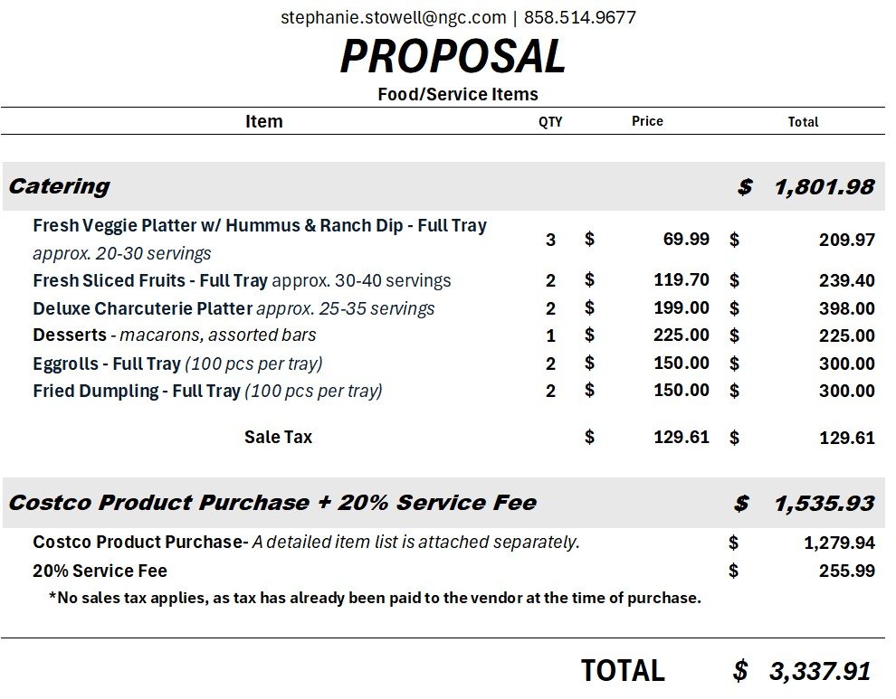Catering – $1,801.98(Subtotal: $1,672.37 + Tax: $129.61)